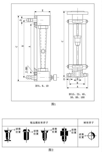 原理與結(jié)構(gòu):玻璃轉(zhuǎn)子流量計(jì)主要由一根自下而上擴(kuò)大的錐形玻管和一只隨流體流量大小上下移動(dòng)的浮子組成(圖3)。流體自下而上流經(jīng)錐管時(shí),流體動(dòng)能在浮子上產(chǎn)生的升力S和流體的浮力A使浮子上升,當(dāng)升力S與浮力A之和等于浮子自身重力G時(shí),浮子處于平衡,穩(wěn)定在某一高度位置上,錐管上的刻度指示流體的流量值。流量計(jì)中浮子讀數(shù)位置按圖2所示: